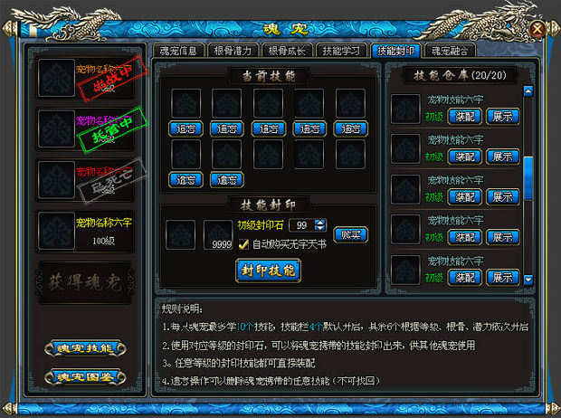 技能一旦获取,就可以被封印起来,被封印的技能类似于玩家给所有魂宠建立了一个技能库,等到需要更换宠物的时候,可以将封印的技能直接赋予新的魂宠