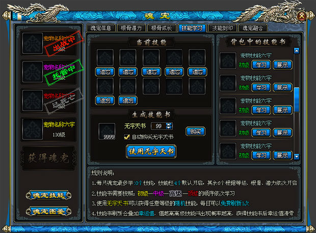 魂宠技能的资料库,可以查询并选择自己需要的技能去定向获取